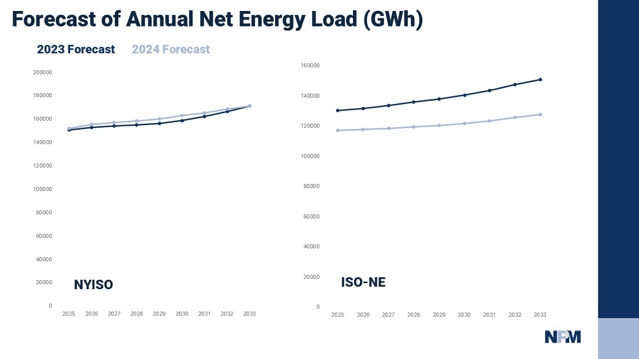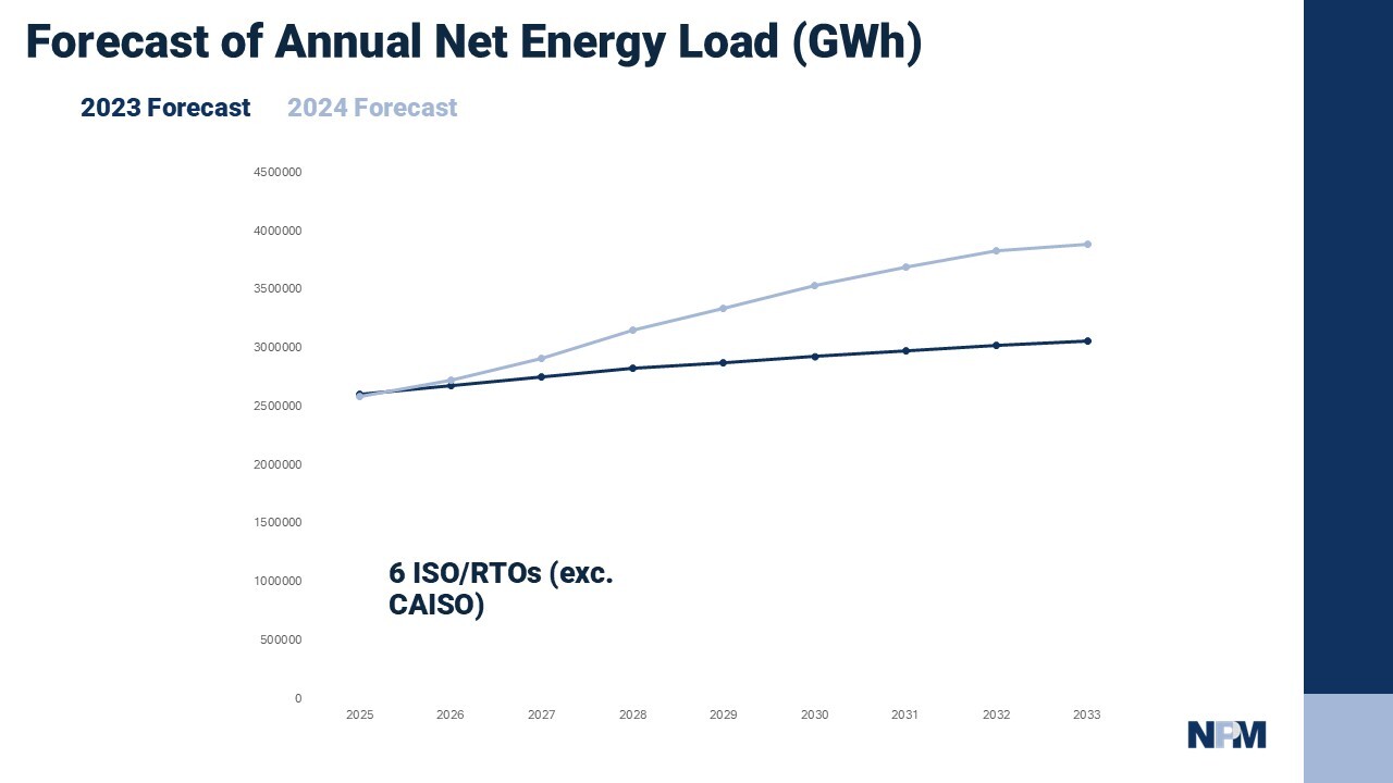 We see across the six analyzed ISO/RTOs that, combined, they are now predicting 3,894,010 GWh of annual energy load, up 27% from 3,065,922 GWh forecasted in the 2023 report. We selected the 2033 date as it is the furthest date present in the 10-year forecasts of the 2023 and 2024 reports. There is a 5-month lag in the publishing of these 10-year forecasts by each balancing authority to FERC.